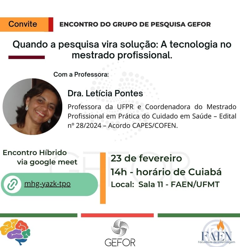 Nosso encontro será aberto e contará com a participação da Dra. Letícia Pontes, Professora da UFPR e Coordenadora do Mestrado Profissional em Prática do Cuidado em Saúde – Edital nº 28/2024 – Acordo CAPES/COFEN.